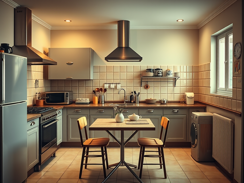 La cocina es funcional y aislada, concebida únicamente como espacio operativo separado del hogar.